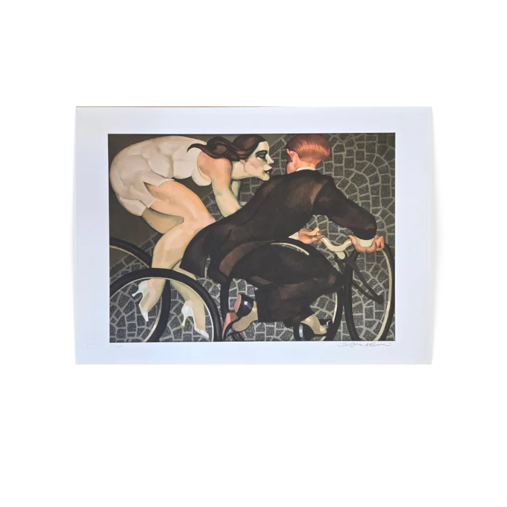 A cena mostra um casal sobre uma bicicleta em deslocamento lateral, visto de perfil e levemente de cima, recurso compositivo que intensifica a sensação de instabilidade emocional. O homem, vestido em terno marrom escuro, projeta-se para frente com gesto decidido, enquanto a mulher, envolta em vestido branco luminoso, inclina-se em direção a ele com expressão quase sussurrada. Essa aproximação cria um campo de intimidade dramática que transforma o deslocamento físico em metáfora afetiva.
